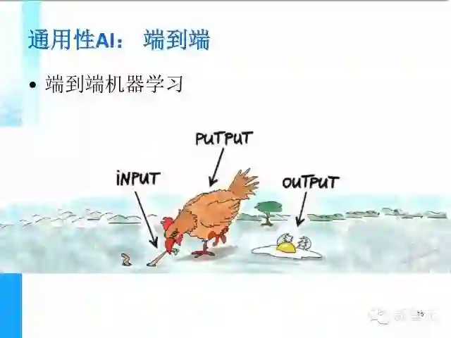 这种通用型,端到端的学习,可以用这个例子来表达:鸡可以吃不同的东西,但是它下的都是蛋,是对人类有用的。