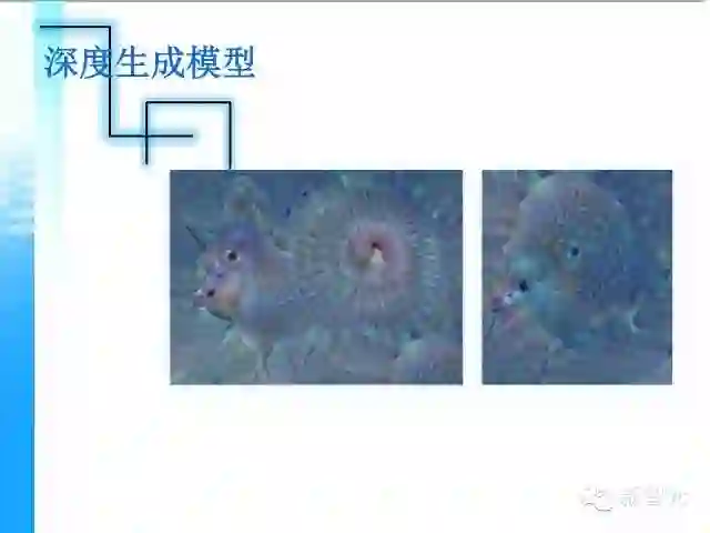 同时深度模型还可以把它反转,成为一种生成模型。它不仅可以去对数据做一个决策,它还可以自己产生新的数据。比方说这个是Google的一些研究员把一个深层模型里面的感知最深刻的那些图像给描述出来,结果是这样非常有趣的生成模型。