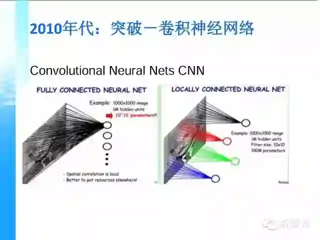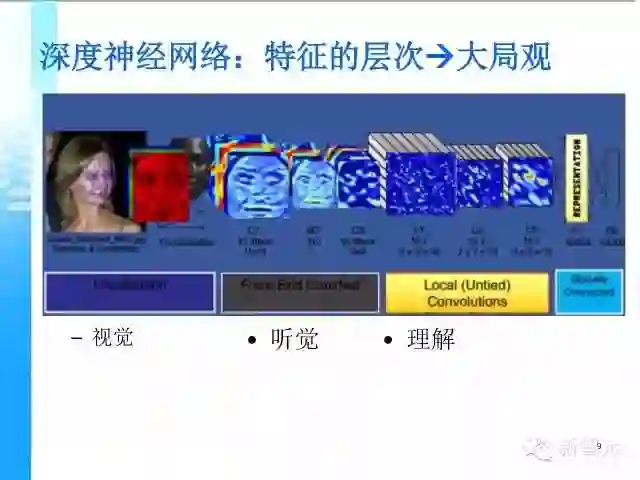 这个之后,就是深度神经网络。深度神经网络的突破从计算上来说有几个好处,其中一个好处是说它把一个全局计算的需求变成一个本地计算的需求,在做到这一点的同时,又不失掉很多的信息,这个是计算机里面无数成就的一个中心点。这样的一个成功就使得我们能够在不同的层次来观察同一个数据,同样就可以获得我们所谓的大局观。就像这个图,我们在不同的层次可以得到不同的特征。