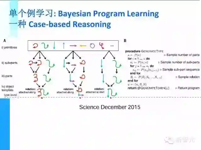 最近发表的一篇文章也说明了迁移学习的重要性。这篇文章叫做 bayesian program learning(单个例学习),这是从一个例子就能学会,我们知道深度学习是有千万个例子的。实际上它用了我们过去没有涉及到的概念,就叫做结构,如果我们了解了一个问题的结构,那么这个结构的一个具体形式只用一个例子就可以学会了。其他的部分,需要很多例子的那一部分可能是参数、统计,这一部分我们实际上可以通过迁移学习来学习。也就是说这个圆就圆满了,就是一个闭环了。