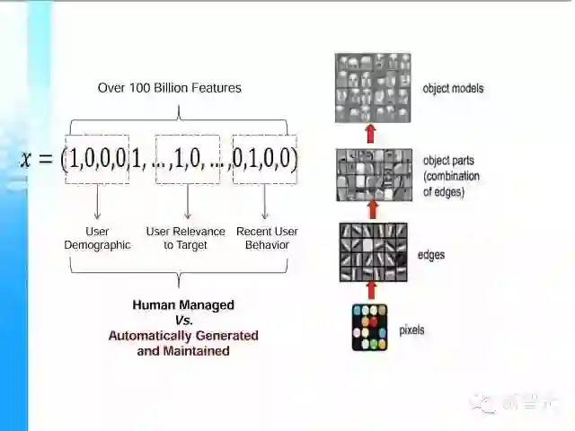 所以我们又得到另外一个概念,就是特征工程。深度学习给我们的一个有力工具是能够自动进行不同层次、大规模的新特征的抽取和制造。那么这种特征在搜索引擎、广告系统上面可以达到万亿级,这个已经完全不是人类所可以控制的级别了。智能在这样的级别上才可以产生。