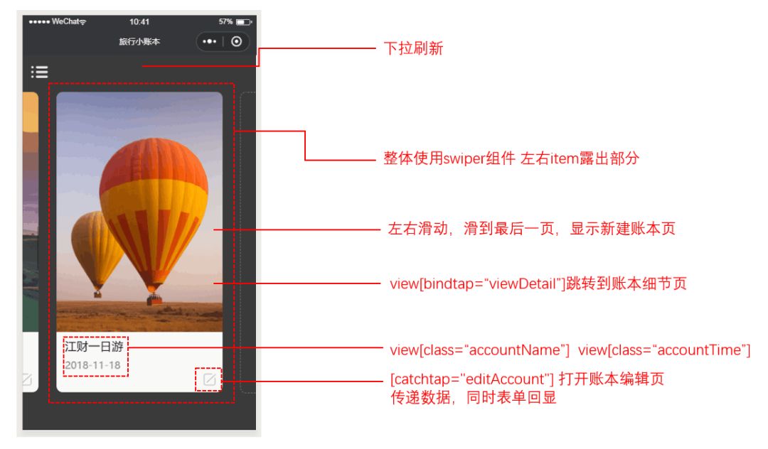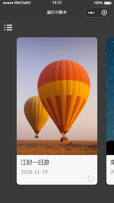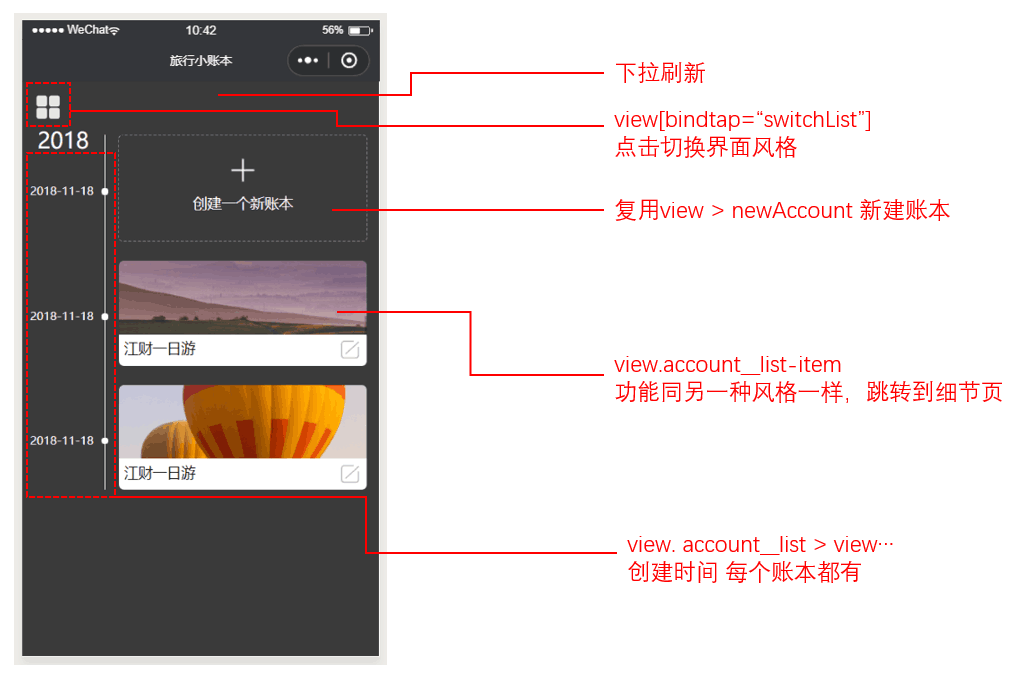 账本页有两种显示的风格,左上角的按钮可以来回切换风格,下拉可刷新页面,显示accounts数据表中存储的账本信息。显示时有个小细节,需要根据创建的时间先后来显示,越晚创建的越先显示: