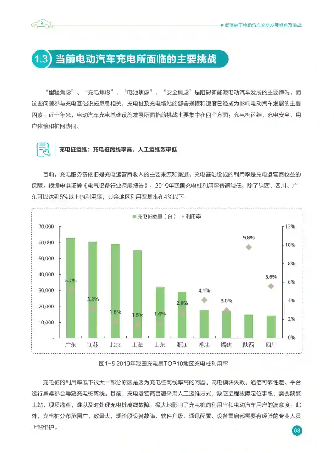 现阶段,在实践中暴露出来的电动汽车充电基础设施发展所面临的挑战和瓶颈主要集中在充电桩运维低效、充电安全保障不到位、用户体验亟需提升和桩网协同方式不完善共四个方面。我们需要找到经济、可靠和绿色的创新模式,破局增长之困。