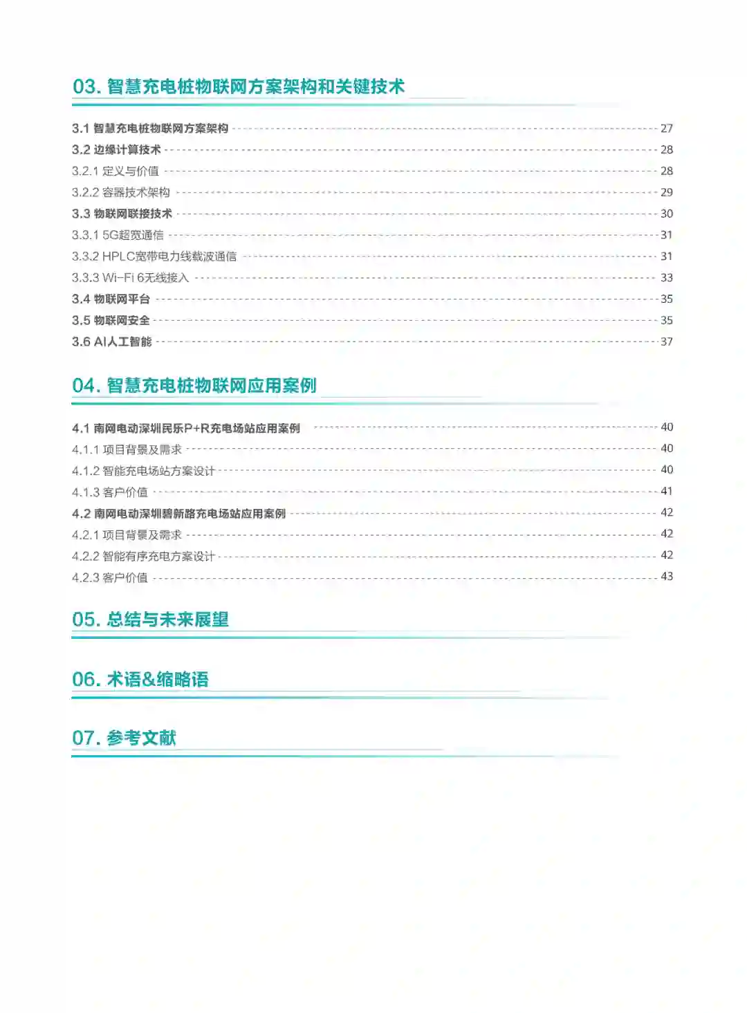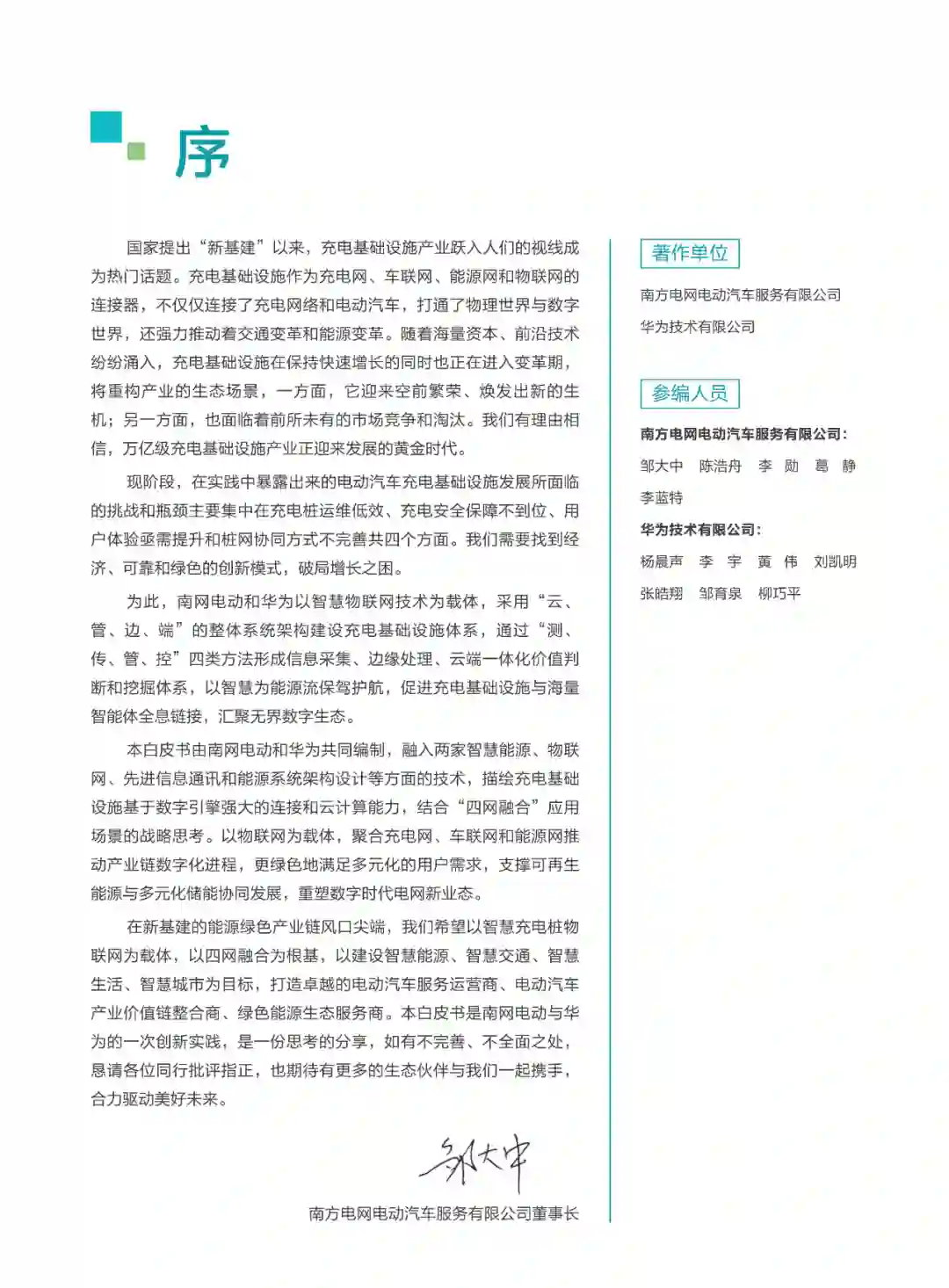 在新基建的能源绿色产业链风口尖端,我们希望以智慧充电桩物联网为载体,以四网融合为根基,以建设智慧能源、智慧交通、智慧生活、智慧城市为目标,打造卓越的电动汽车服务运营商、电动汽车产业价值链整合商、绿色能源生态服务商。本白皮书是南网电动与华为的一次创新实践,是一份思考的分享,如有不完善、不全面之处,恳请各位同行批评指正,也期待有更多的生态伙伴与我们一起携手,合力驱动美好未来。