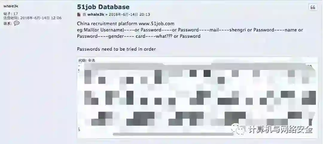 黑客圈人士对记者分析,暂时无法确认是因为数据库泄露造成,还是撞库导致的,“怀疑有人从其他地方挑选了一些数据,伪装成51job被拖库,拿其数据售卖。”