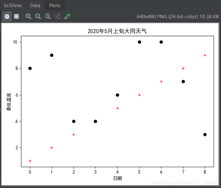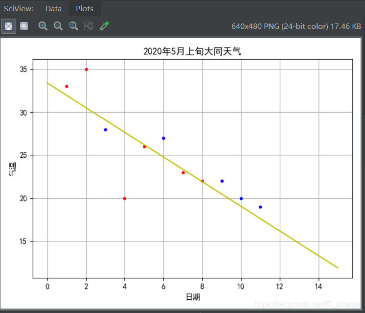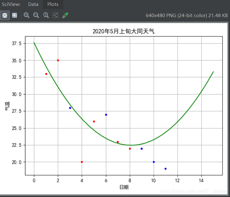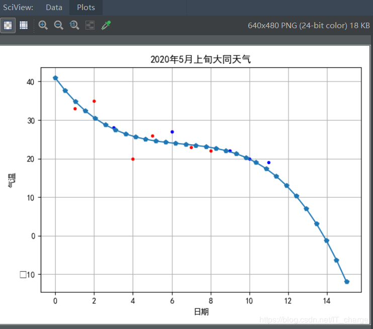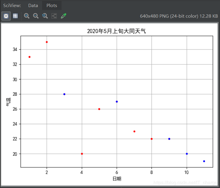 plt.ylabel('气温',fontsize=10) # y轴显示“气温”,字体大小设置为10