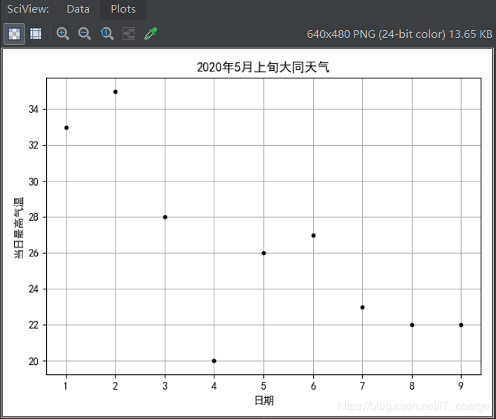 plt.title('2020年5月上旬大同天气',fontsize=25) # 字体大小设置为25