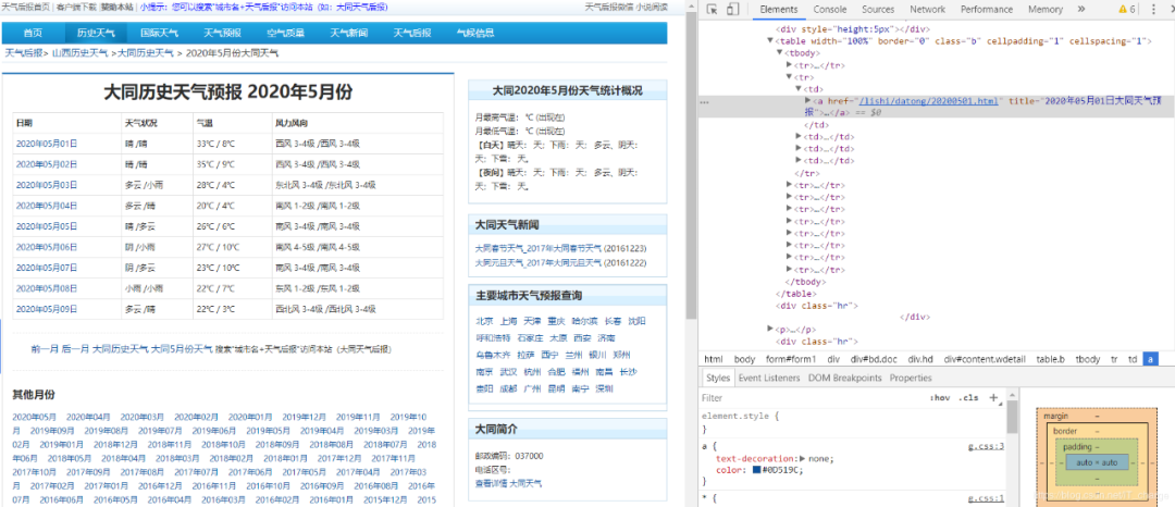 # 爬取目标网页(大同市2020年5月份天气[网站:天气后报])