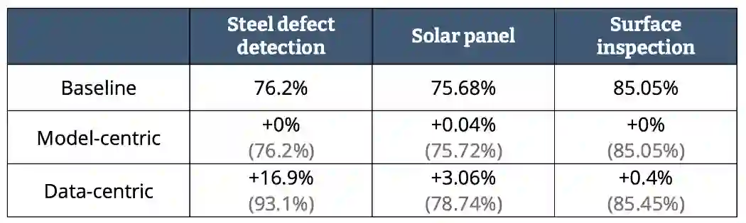 即使我们对钢铁缺陷这些事情没有什么了解,模型性能在数字上的显著提升我们是看得见的。我们可以看到,以模型为中心的方法对基线的改进不是零就是接近零,而且这种方法往往需要花费从业者数百小时的时间。