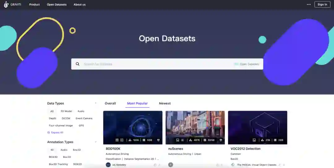 在格物钛公开数据集平台(gas.graviti.cn/open-datasets),用户可以通过数据集的名称联想检索、应用场景筛选、标注类型筛选、推荐、更新时间及热度筛选,轻松找到所需数据集。同时,用户无需下载,即可在数据集详情页在线查看标注情况及标签分布,掌握数据细节。