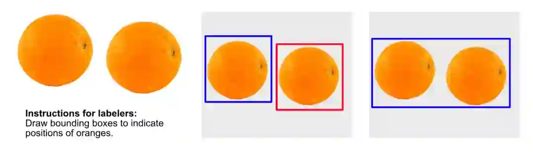 我们可以看到,大多数数据集并没有太多的数据。在以数据为中心的方法中,数据集的大小并不重要。当然,我们不可能用三张图片去训练神经网络,但我们的重点要放到质量上,而不是数量。就算我们没有成百上千的图片也没关系,已有的数据质量和标注准确度是至关重要的。我们可以参考下面的例子,下图是标注人员为两个橙子的位置做出的两种不同的标注方法。