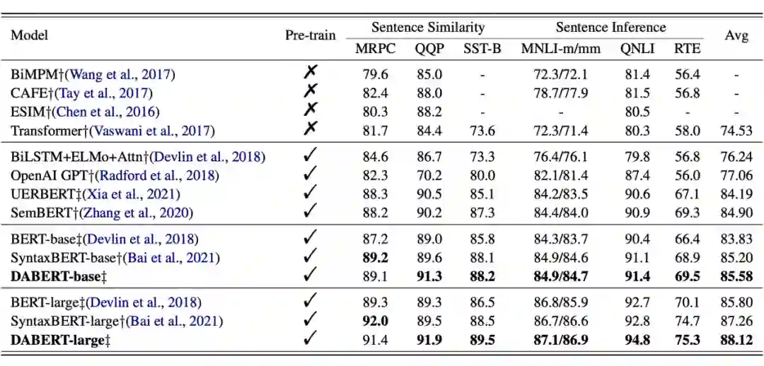 1)GLUE 数据集:作者在 6 个 GLUE 数据集上 finetune DABERT,下表显示了 DABERT 和其他基线的性能比较。可以看出,由于 PLMs 具有较强的上下文感知能力和数据拟合能力,使用非预处理模型的性能明显不如预训练模型。当主干模型 BERT-base 和 BERT-large 时,DABERT的平均精度分别比普通 BERT 提高 1.7% 和 2.3%。这也证明了融合差异关注对挖掘语义的优点。