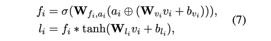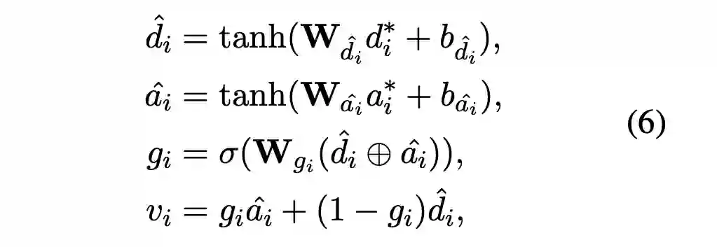 2)融合门控,也是常规操作,动态对每个 position 的向量加权融合,公式如下: