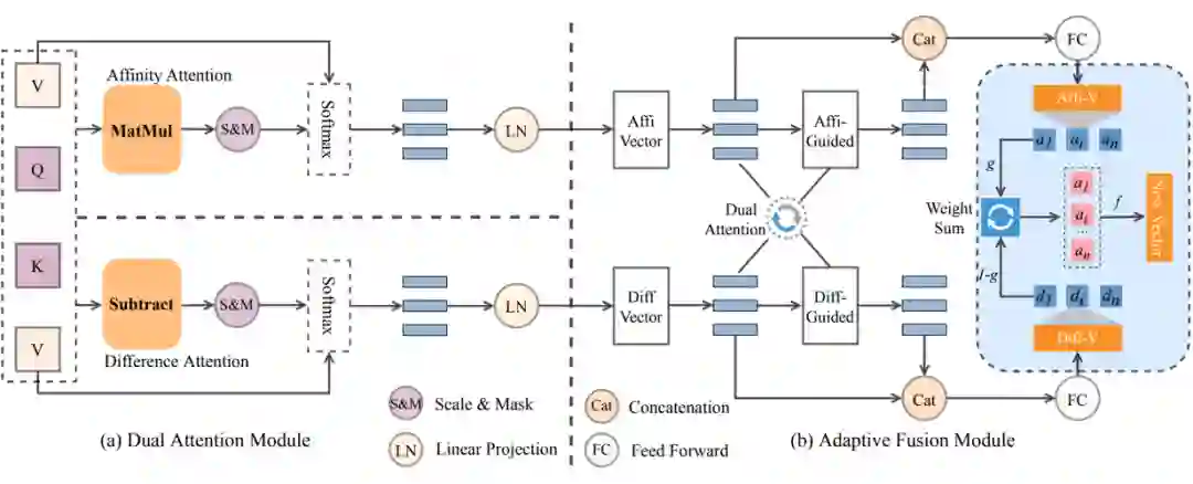 针对第一个问题,本文提出一种双注意模块,它在多头注意中使用双通道机制来匹配两个句子之间的单词。每个通道使用不同的注意头分别计算亲和力和差异分数,并获得两种表示分别测量亲和力和差别信息。