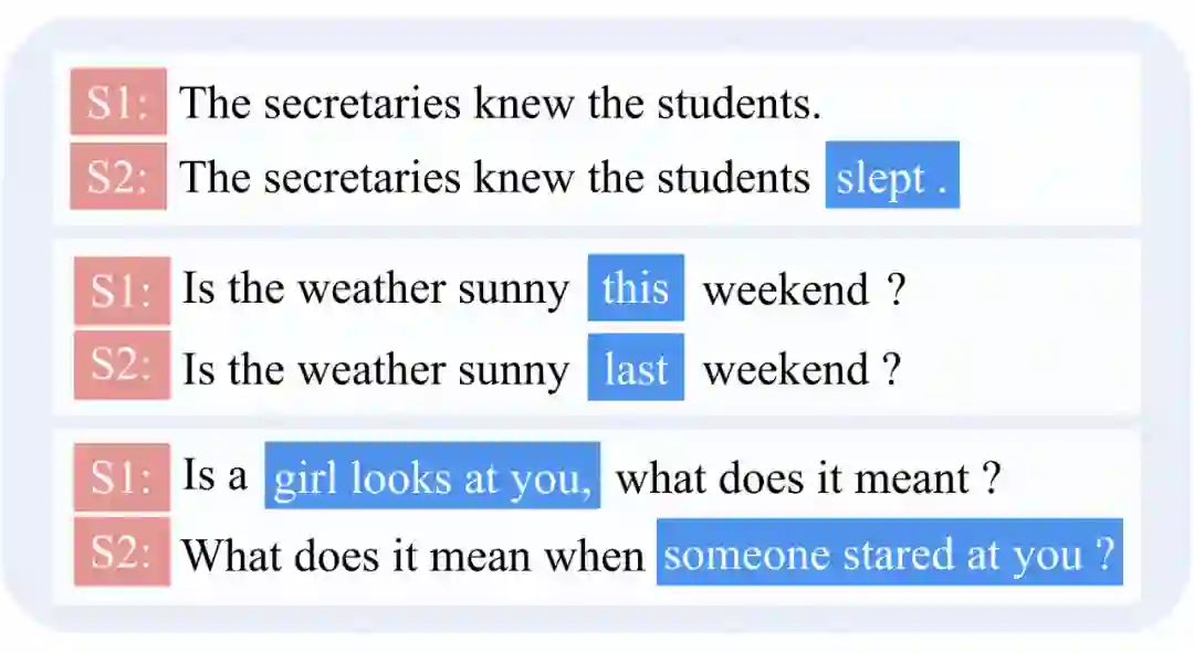 例如下图的例子,诸如单词的添加,删除和修改句子之类的细微改动可能会导致语义预测错误。尽管图中的句子对在语义上有所不同,但它们在字面上过于相似,以至于那些预先训练好的语言模型无法准确区分。