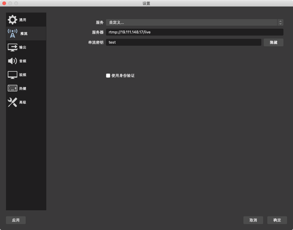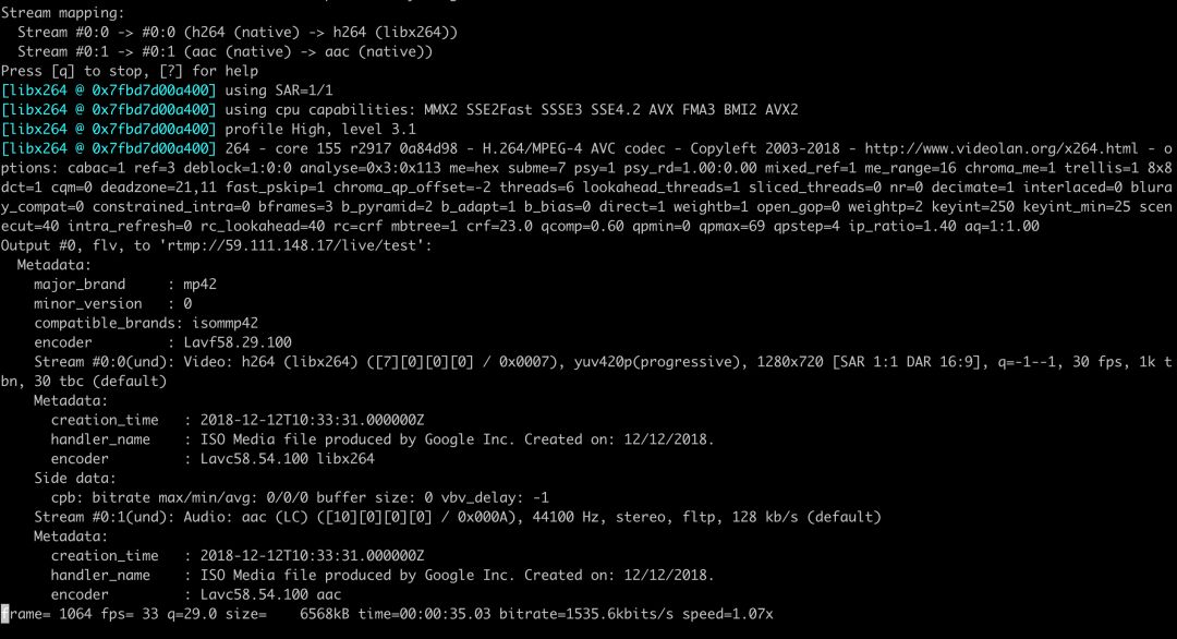 ffmpeg -i test.mp4 -vcodec libx264 -acodec aac -f flv rtmp://IP地址/live/test