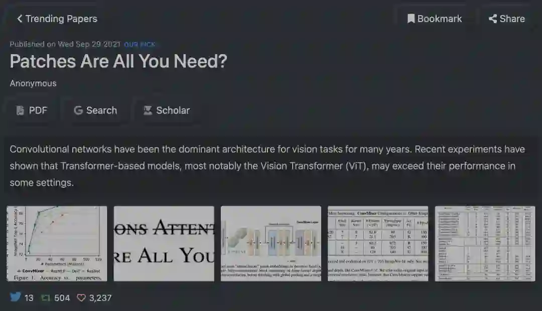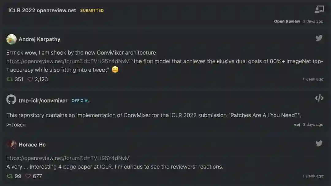 就拿很火的《Patches Are All You Need》来说吧,13条推文,504个转发,3237个点赞。
