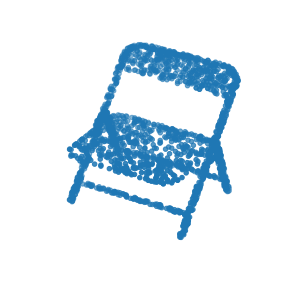 points = mesh.sample(2048)fig = plt.figure(figsize=(5, 5))ax = fig.add_subplot(111, projection="3d")ax.scatter(points[:, 0], points[:, 1], points[:, 2])ax.set_axis_off()plt.show()