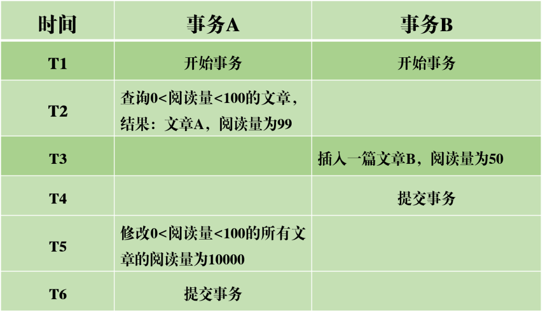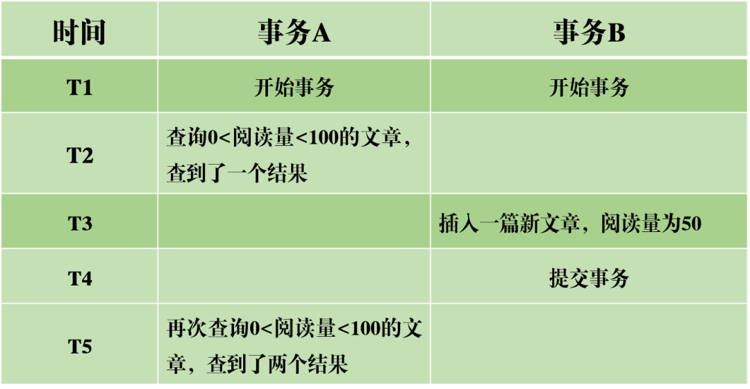 以上图为例,当对0<阅读量<100的文章进行查询时,先查到了一个结果,后来查询到了两个结果。这表明同一个事务的查询结果数不一,行数不一致。这样的问题使得在根据某些条件对数据筛选的时候,前后筛选结果不具有可靠性。