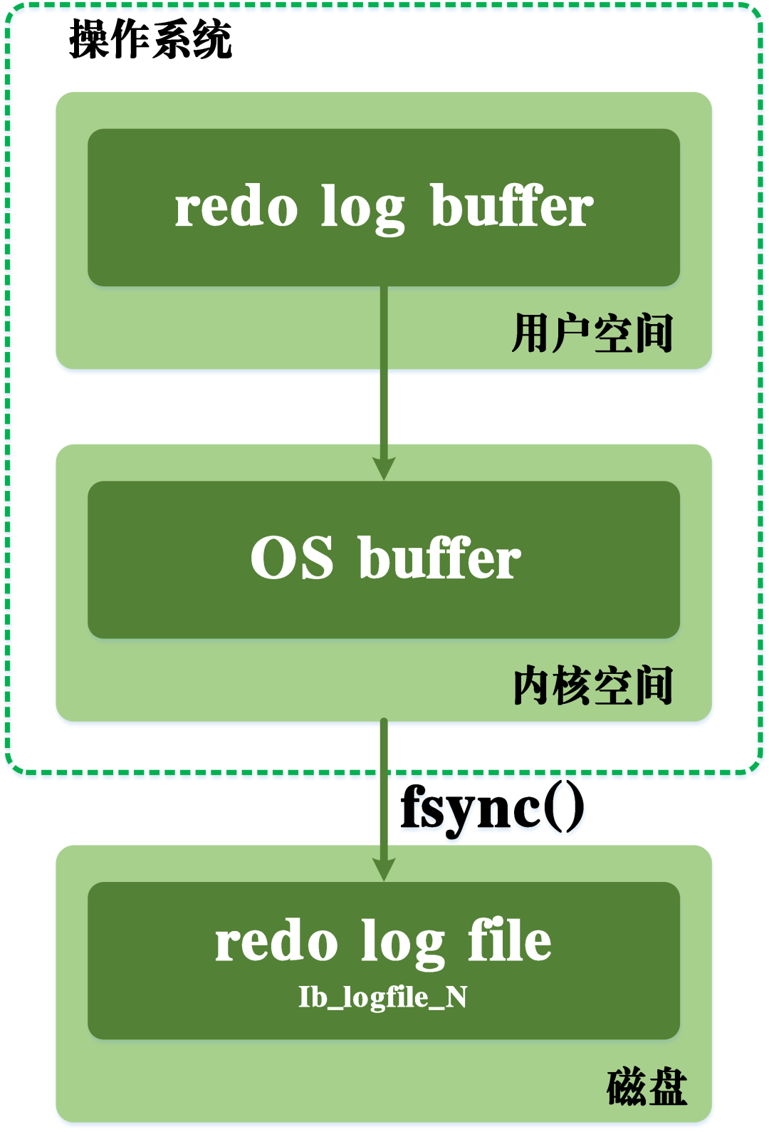 为了确保每次记录都能够写入到磁盘中的日志中,每次将redo log buffer中的日志写入redo log file的过程中都会调用一次操作系统的fsync操作。
