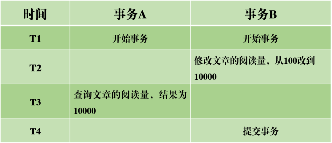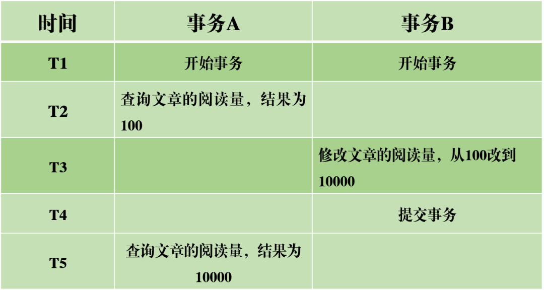 以上图为例,事务A在先后读取文章阅读量的数据时,结果却不一样。说明事务A在执行的过程中,阅读量的值被其它事务给修改了。这样使得数据的查询结果不再可靠,同样也不合实际。