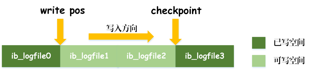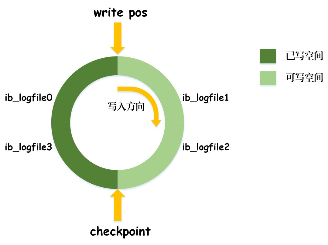 当write_pos标志到了日志结尾时,会从结尾跳至日志头部进行重新循环写入。所以redo log的逻辑结构并不是线性的,而是可看作一个圆周运动。write_pos与checkpoint中间的空间可用于写入新数据,写入和擦除都是往后推移,循环往复的。