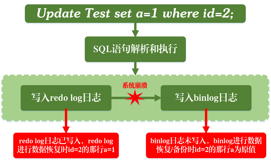 在写完redo log之后,数据此时具有crash-safe能力,因此系统崩溃,数据会恢复成事务开始之前的状态。但是,若在redo log写完时候,binlog写入之前,系统发生了宕机。此时binlog没有对上面的更新语句进行保存,导致当使用binlog进行数据库的备份或者恢复时,就少了上述的更新语句。从而使得id=2这一行的数据没有被更新。