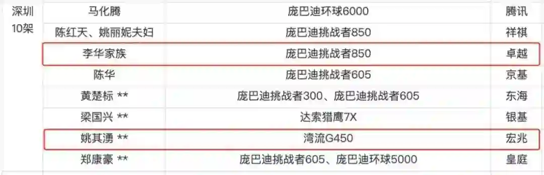 刘强东、姚其涌和李华还是为数不多的拥有私人公务机的中国企业家。《2017年胡润公务机机主报告》显示,在当年深圳地区的10家公务机中,姚其湧和李华各自拥有一架,分别是“湾流G450“和“庞巴迪挑战者850”。在这份报告中,刘强东也出现其中,他所拥有的是一架“湾流G650“公务机。