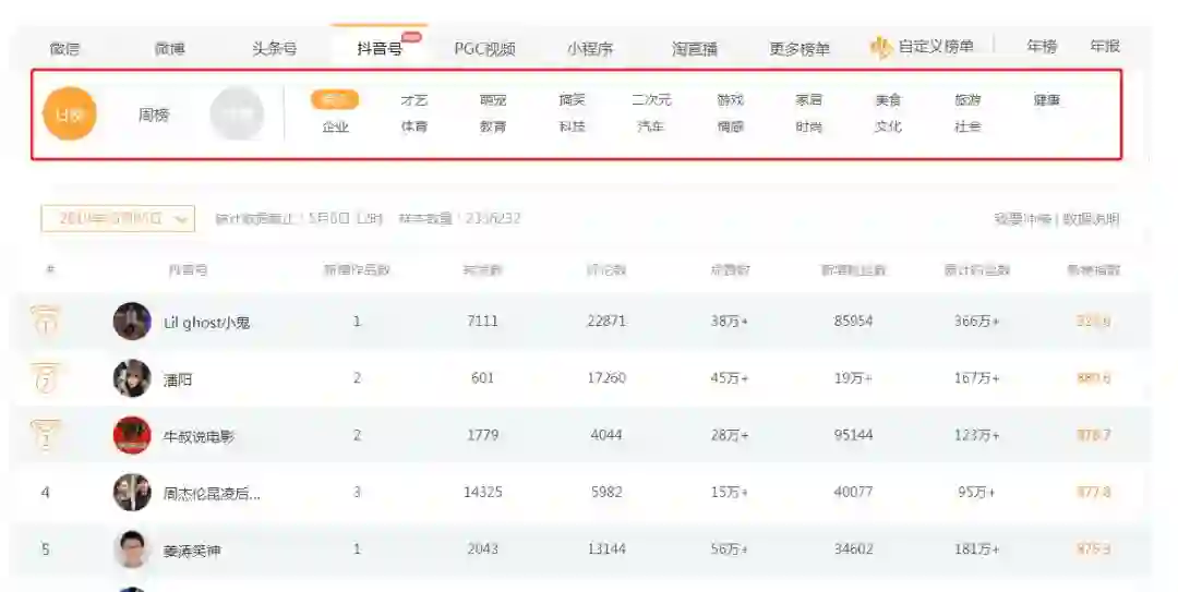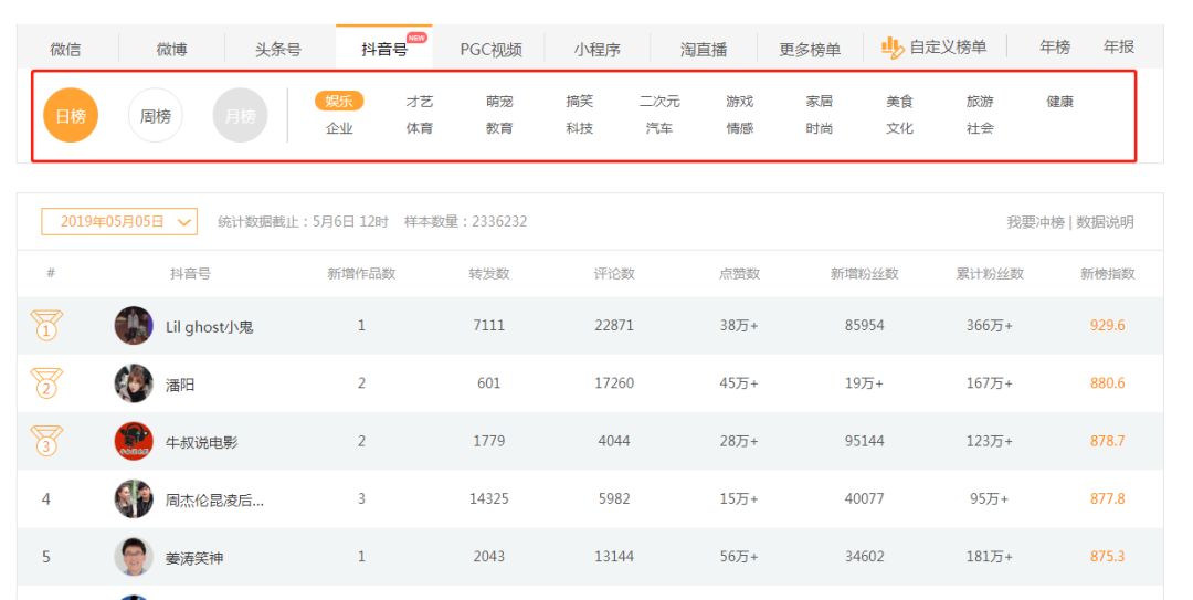 新榜是做微信公众号排行榜起家的,数据资源库丰富准确,它的抖音号排行榜同样做得很棒。