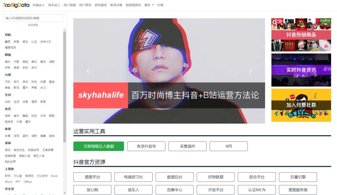 Toobigdata 数据功能同样丰富,汇集了抖音各大实用数据功能,包括最新行业资讯、抖音官方平台链接、热门商品、热门数据、账号诊断等等实用工具。