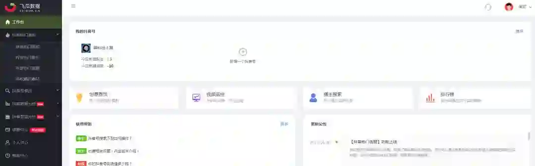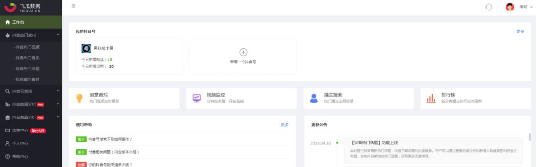 它的功能很齐全,可以做单个抖音号的数据管理,查看日常的运营情况;也可以对单个视频做数据追踪,知晓它的传播情况。