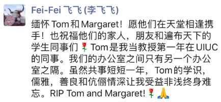 除了研究成果颇丰,黄教授一直以来还以他的高尚人品和学术精神著称。2016年教授八十华诞之时,朱松纯教授曾撰文称,「在我们这个领域,不论年龄大小、学历高低,都叫他Tom, 平时没人称他黄教授,更没有听到谁称他黄院士。」黄煦涛教授的学生、美国西北大学的吴郢教授曾在《视觉求索》专刊中用12个字描述了Tom的学术人生,淡泊名利、宁静致远、求道至简。黄老从教50年,直接培养的研究生过百人,无数在AI领域小有建树的名生后辈都受过他的点拨,其中包括:依图科技CTO的颜水成,云从科技的周曦,文远知行的韩旭和宁华中,奇点汽车的黄浴以及AI女神李飞飞。 在周曦看来,老师教给他的收获远不止论文中可见的研究成果,更是背后多年的技术积累与理论知识。直至现在,云从的官网上依然写着「源于计算机视觉之父」,感恩之情深藏其中。在创立文远知行之前,韩旭和宁华中两位的履历也是响当当的,一个是百度自动驾驶部门首席科学家,另一个是前Facebook人工智能科学家和Google资深软件工程师。恩师的光芒一直照耀着这些创业者在求索道路上永不停歇。 韩旭发文悼念,Would you know my name If I saw you in heaven? Would it be the same If I saw you in heaven?AI女神李飞飞也曾受到过黄煦涛教授的点拨。李飞飞视黄为人生导师,她曾经表示,早期的工作就是黄教授给的,如果没有Tom的支持,她是没法当上这个教授的。 李飞飞也发文缅怀Tom和Margaret!愿他们在天堂相逢携手!也祝福他们的家人,朋友和遍布天下的学生同事们 Tom是我当教授第一年在UIUC的同事。我们的办公室之间只有另一个办公室之隔。虽然共事短短一年,Tom的学识,儒雅,善良和伉俪情深让我受益非浅终身难忘。RIP Tom and Margaret! 🙏