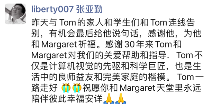 联想集团首席技术官芮勇:恩师 Prof. Tom Huang 离我们而去。Tom 是计算机视觉,人工智能,多媒体泰斗,美国工程院,中国两院院士。为世界计算机界发展做出来重大贡献。不过对我们学生来说,我们更记住的是 Tom and Margaret 的为人师表,是我们一生的楷模! Tom and Margaret 做事做人令我们无法望其项背,唯有时刻鞭策自己。有幸昨天在视频里见Tom一面,但现在任然无法相信!愿Tom & Margaret 在天堂相聚!恩师Tom一路走好。我们100多学生为您祈祷。地平线创始人余凯:很突然,也很难过!Tom是计算机视觉领域世界级的泰斗,也极其支持华人青年学者在美国学术圈的成长。大概10年前有幸和Tom有过5-6年的合作,那时候几乎每年他都挑选几位最好的博士生来我的Lab实习。有一年冬天去UIUC访问他,他和Margaret在请我在餐馆吃饭,Margaret那时候已经有抑郁症,但是晚饭后Tom颤颤巍巍的搀扶着Margaret在雪夜中离去的背影,让我至今难忘!Tom为人为学都是我的楷模!至人无己,神人无功,圣人无名。愿Tom和Margaret在天堂安息!🙏🙏🙏
