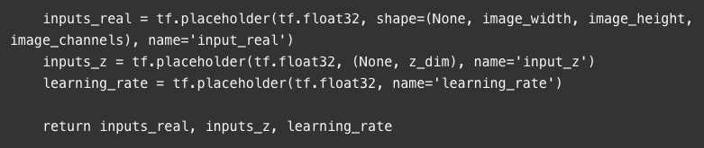 在我们开始定义我们的两个网络之前,我们首先要定义我们的输入。我们这样做是为了不让杂乱的训练过程变得比现在更加混乱。在这里,我们只是简单地定义TensorFlow占位符,用于我们真实和虚假的图像输入以及为了保存我们的学习率的值。