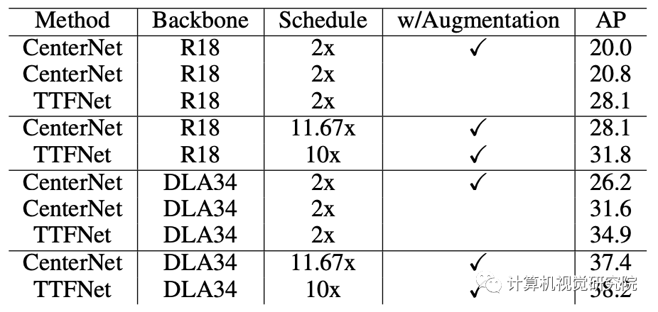 较大的学习速率不能帮助CenterNet更快地收敛,并且删除数据增强会导致性能变差。根据上面的结论,我认为这是因为CenterNet在训练过程中只在目标中心编码一个单一的回归样本。这种设计使得CenterNet在很大程度上依赖于数据增强和较长的训练时间,导致不友好的训练时间。