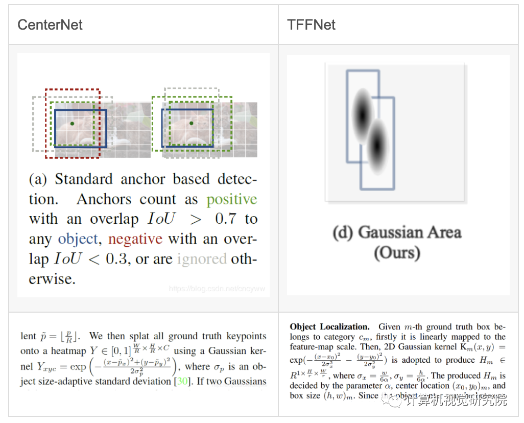对于Center点的位置回归,两个方法都用到了高斯核来增加正样本的数量,也都用到了Focal Loss。但是CenterNet核CornerNet一样,高斯核里的参数sigema只和bbox的面积有关,没有充分考虑bbox的纵横比,而TFFNet为长和宽分别设置了sigema,从而更加合适。