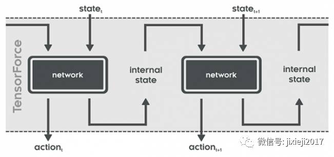 不同于经典的监督式学习instances的设置,强化学习一个 episode 中的时间步取决于之前的动作,并且还会影响后续的状态。因此除了其每个时间步的状态输入和动作输出,可以想象神经网络可能有内部状态在 episode 内的对应于每个时间步的输入/输出。下图展示了这种网络随时间的工作方式: