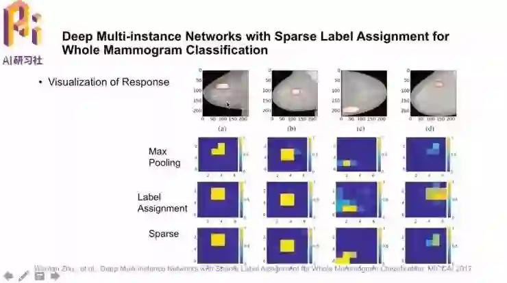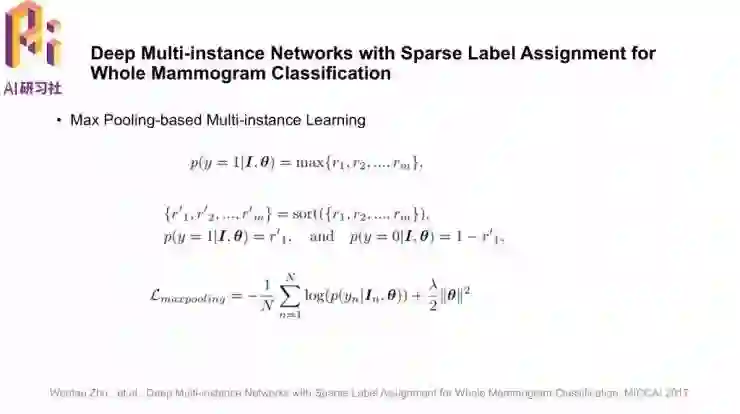 论文名称是「Deep Multi-instance Networks with Sparse Label Assignment for Whole Mammogram Classification」。模型的总体框架是,首先对输入图像进行分割、缩放得到感兴趣的区域,通过CNN提取很多区块后,用线性回归分类器得到可能性排序,最后根据机器学习模型得到影像的判定结果输出。