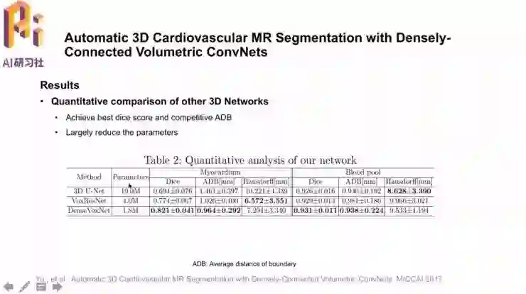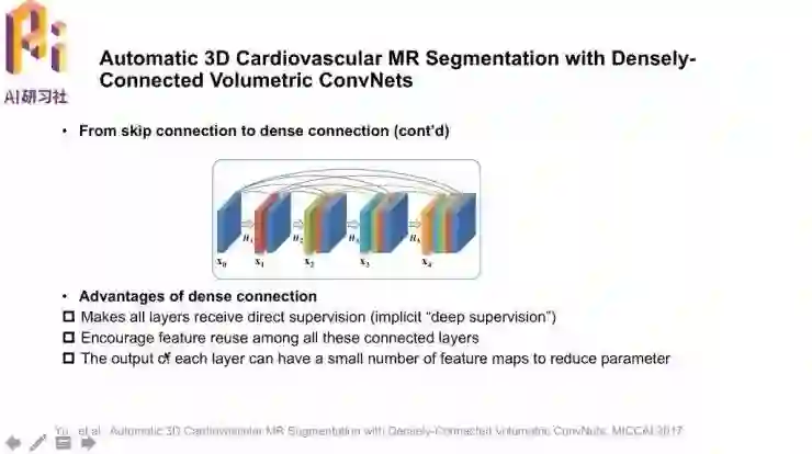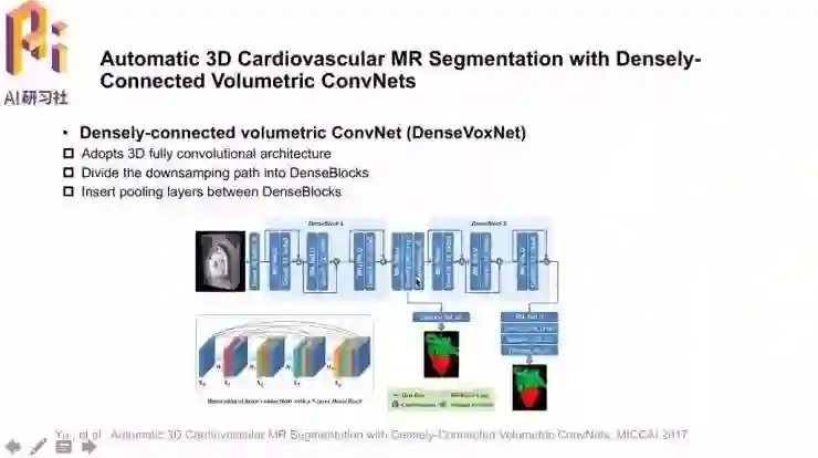 这篇论文「Automatic 3D Cardiovascular MR Segmentation with Densely-Connected Volumetric ConvNets」也就来自陈浩博士团队,任务目标是全心脏的三维体积分割,采用了三维全卷积神经网络,并且把下采样的路径分成了不同的DenseBlock块,在不同的DenseBlock中增加池化层增大感受野。