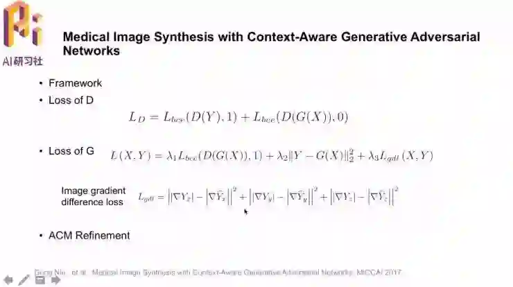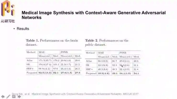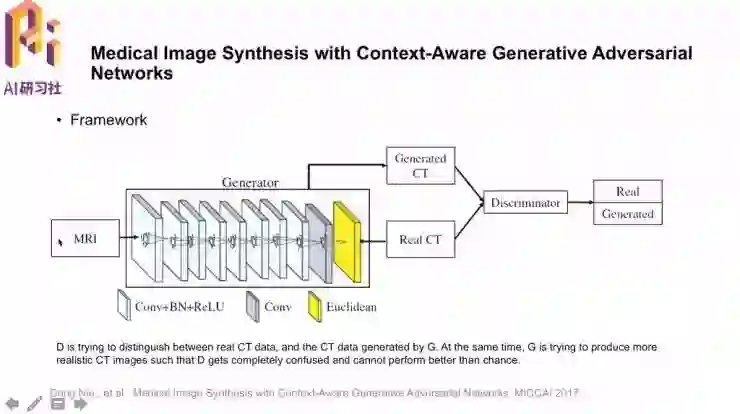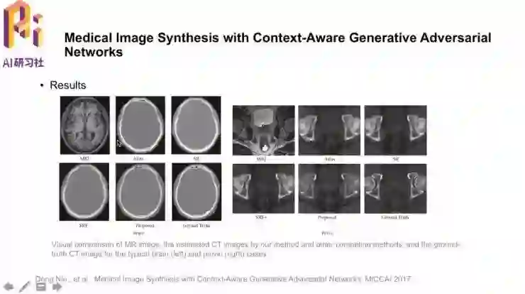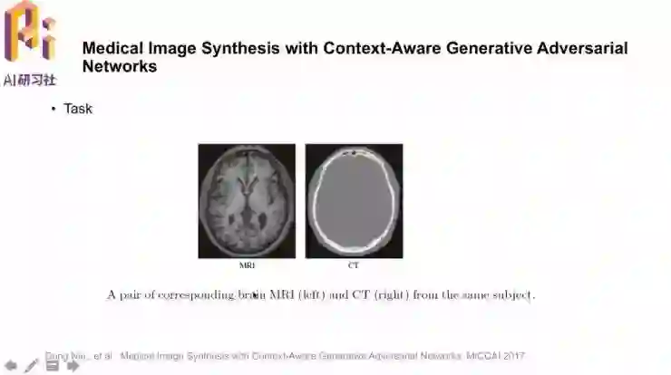 「Medical Image Synthesis with Context-Aware Generative Adversial Networks」。研究的任务就是用MRI图像生成对应的CT图像,这样做的是可行的,因为图像中有一些信息是共享的;要这样做的原因是,用MRI图像合成CT图像,就可以避免做CT时的辐射。