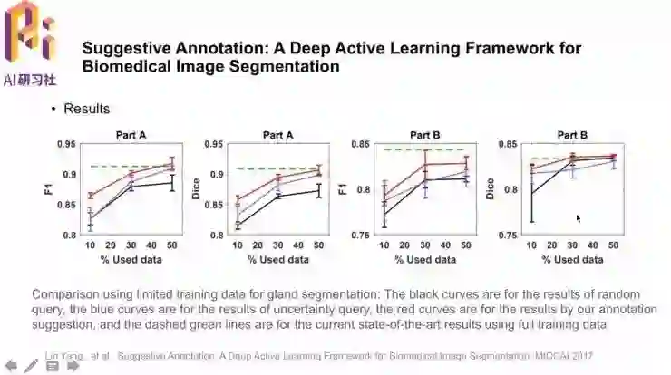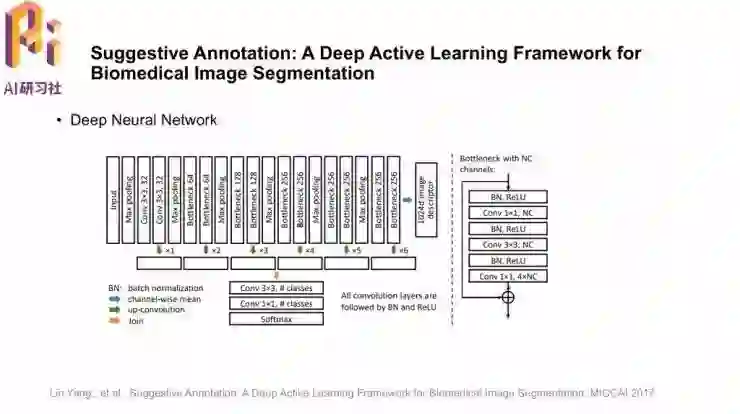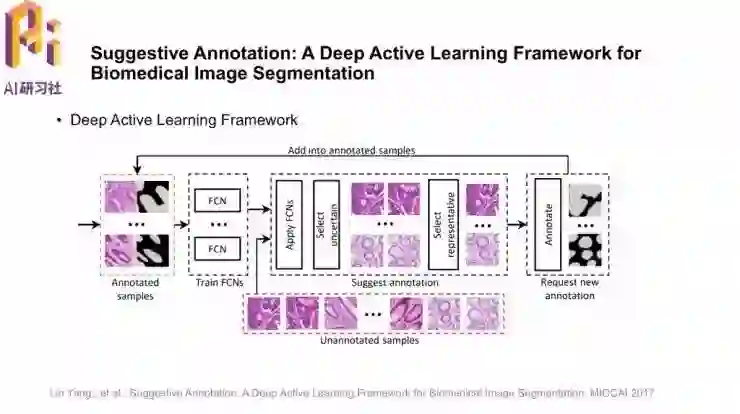 这篇「Suggestive Annotation: A Deep Active Learning Framework for Biomedical Image Segmentation」中的亮点就是采用了主动学习的框架,选取不确定的、有代表性的样本进行标注并训练模型;一直重复这个过程可以更好地指导模型学习,这就是模型中的建议标注suggestive annotation。