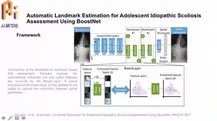 输入X光图像,经过卷积层后,BoostLayer的作用是去除大于两倍标准差σ的偏离值,再经过带有脊椎形状约束的Spinal Structured层之后,就可以输出关键点的定位结果。
