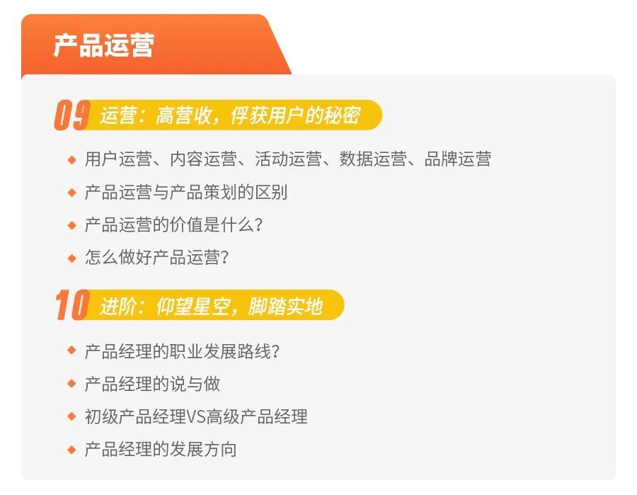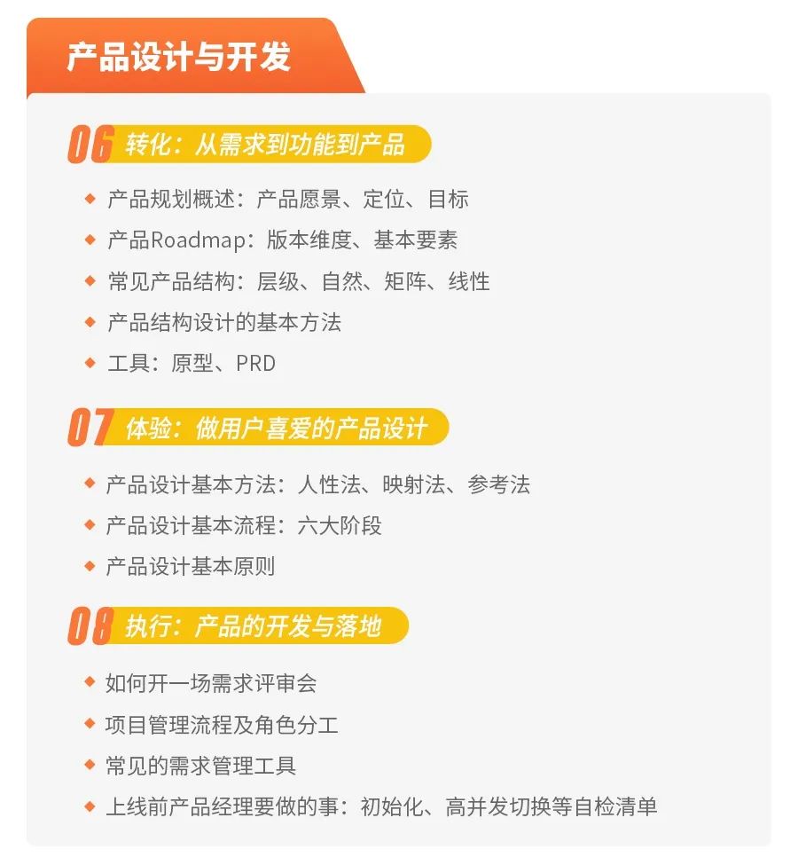 所以这门课程结合了大厂产品经理成长体系以及产品经理实际技能应用,系统地覆盖了产品知识核心6大板块,供大家体系化的学习参考。