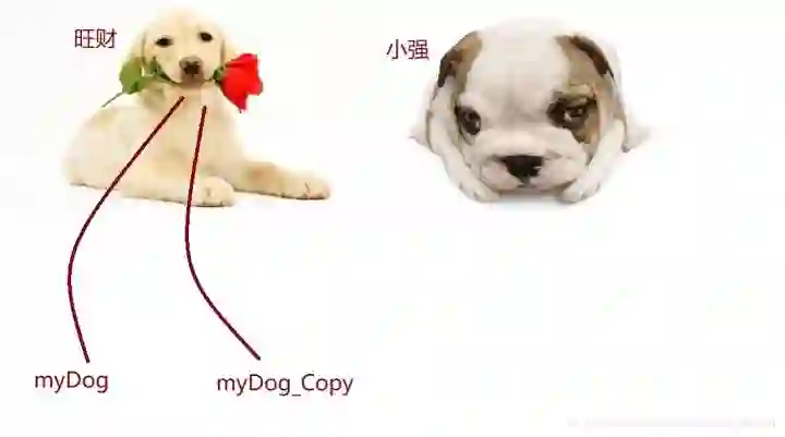 接着执行dog= new Dog(),这一行代码,就是把复制出来的那一条狗绳,从myDog解绑,重新绑到new出来的那只小狗上,也就是后来被起名为“小强”的小狗:
