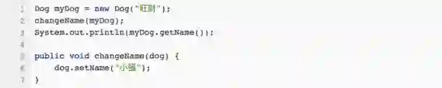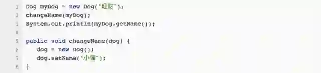 而myDog还是绑在旺财身上,这也就解释了,为什么执行完方法出来,myDog.getName()还是旺财。而在第一段代码里面,我们没有执行dog= new Dog(),也就没有改变dog所绑的小狗,dog还是绑在旺财身上,因此dog.setName(“小强”) 就把旺财的名字改成小强了。