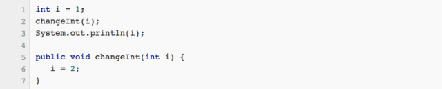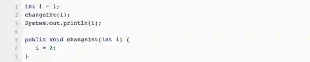 对于基本数据类型,他们没有引用,但是不要忘了,调用函数时,复制的动作还是会做的,执行changeInt(i)时,会将 i 复制到一个新的int上,传给changeInt方法,因此不管changeInt内部对入参做了什么,外面的 i 都不会受影响。最后打印出来的还是1。
