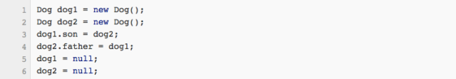 如果JVM采用的是引用计数法,那么狗2原先被dog2和dog1.son两个变量引用这,执行完dog2 = null之后,还被dog1.son引用,狗2是不会被回收的。