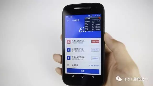 安装完全家桶,再打开百度卫士。通过性能监视器可以看到,在打开百度手机卫士的一瞬间,CPU 占用率立即达到了 100%,并且一直维持在满载的水平,手机已经卡顿到无法操作的程度,这一过程持续了超过两分钟。CPU 温度从 40 度左右直接飙到了 55 度左右。内存的使用率也从升高到了 70%。