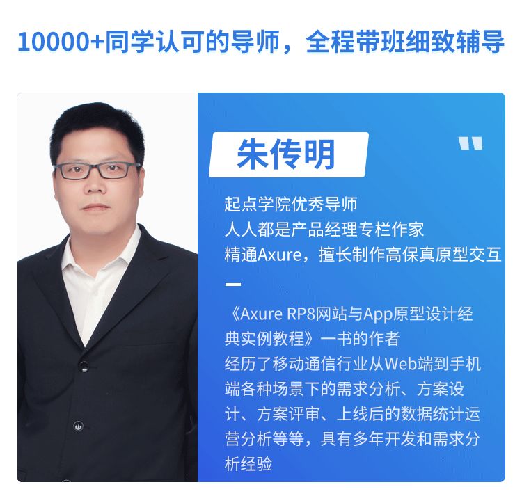 基于此,为了帮助大家更快掌握Axure,降低产品生涯中的时间和机会成本。“腾讯课堂&起点学院”联合打造了6周Axure9.0实战班。