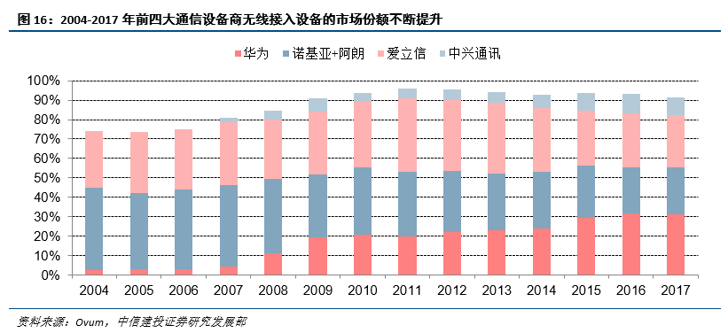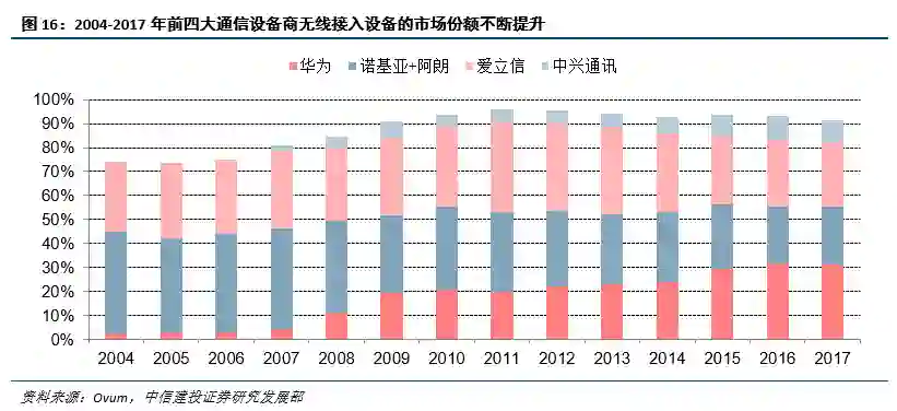 同时,全球的通信设备市场格局也发生了翻天覆地的变化,通信厂商从原来的十余家,逐步整合为四大通信巨头:华为和诺基亚、爱立信、中兴等三家厂商占据了当时全球 3G/4G通信网络设备的绝对市场份额。